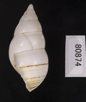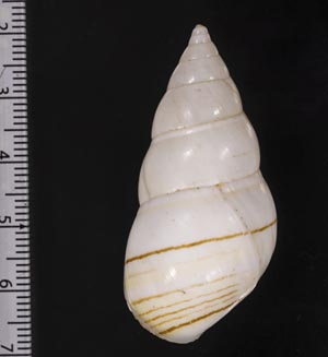 クオリティの説明 Height 47mm F++/+ 貫通しないピンホールが殻頂付近に1つありますが、殆ど分かりません。他は綺麗な標本です。フロリダのLiguusに多い、fasciatusグループの中で、白地にグリーンのラインを主に体層から次体層に複数めぐらし、殻口内側から見て、外唇縁が円鋸歯状(まるいギザギザ状)になります(コンペンディウムより)。 |
