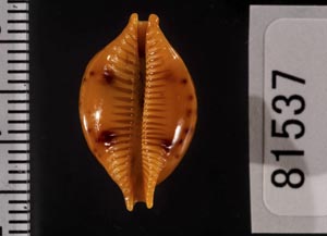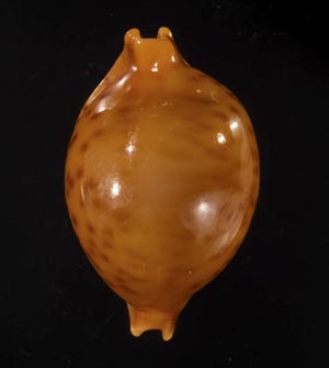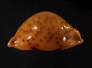 | クオリティの説明 Height 18mm F++/Gem 綺麗な標本です。背面は艶の良い深緋色に更に濃く細かい斑があります。殻口はお約束の濃い黒褐色の斑が4つあります。フィリピン近海からメラネシア地方に分布します。 |
