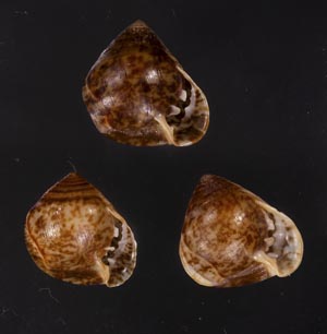 クオリティの説明 Height 12,13,13mm F++/+ 殻口わずかなチップがありますが、綺麗な標本です。3個セットです。全体が変圧されたような奇形になるのが特徴、東南アジア(フィリピン、タイ、ベトナム)、インドに分布します。 |
