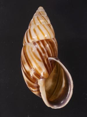クオリティの説明 Height 41mm F++/+ 殻口少しチップがありますが、残肉無しの綺麗な標本です。白と黒褐色のストライプが印象的なミカンマイマイの仲間で、ペルー北部に分布します。 |