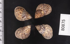 クオリティの説明 Height 24-25mm w/o F++/+ 殻口に少しチップがある個体もありますが、綺麗な生貝採集標本です。フィリップウズラタマキビ螺塔は緩やかに膨らむ。軸唇は広く、えぐられる。8〜9本の一次肋があり、体層には13-18本の太い螺肋と間肋1〜3本と、微細な螺状脈からなる彫刻が見られる。色彩変異多し。暗褐色の個体が優占するが、時には橙色、ピンク色、または黄色がかった個体も見られる。地色より暗く、輪郭がぼやけたダッシュ模様や斑点があり、それらは縫合部分で整列して不明瞭な斜めの縞を形成する。(AUSTRALIAN MARINE SHELLS Vol.1 p.145) 台湾 ; フィリピン; オーストラリアのマングローブ帯の木の幹に生息します。 |