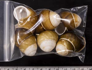 クオリティの説明 Height 35-39mm w/p F++ わずかな殻皮の剥離はありますが、綺麗な標本です。殻皮は抹茶色で、模様などにバリエーションがあります。殻口周縁は茶褐色と白の2種類、縫合下は白と白&茶褐色の帯になる2種類、さらに各層に茶褐色の帯をめぐらす個体がある。 |