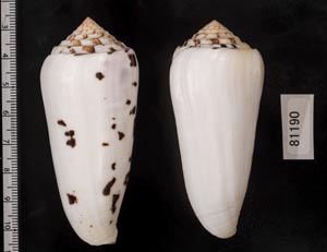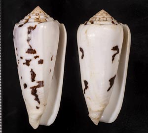 | クオリティの説明 Height 73,78mm F++ 弱い成長傷や、殻口わずかなチップがある個体もありますが、殆どきれいな標本です。二枚目の画像で、外唇が分かるように撮影しています。特価大きめ綺麗な標本です。学名の由来: ラテン語の "gubernator" は統治者、支配者や知事の意。イモガイの中でも堂々とした姿などから由来か?さしずめ、「立派なイモガイ」のような意味でしょうか?和名の由来: 「東雲(しののめ)」とは夜明け前の空が少しずつ明るんでくる様子で、この貝の地色である白地に浮かび上がる褐色の模様が、曙の空の情景を思わせることから来たようです。インド洋の浅海に生息します。同じ種でありながら、点模様の個体、縦縞模様の個体、網目状になる個体、さらにはほとんど模様のない真っ白な個体などFormがいろいろあります。 |